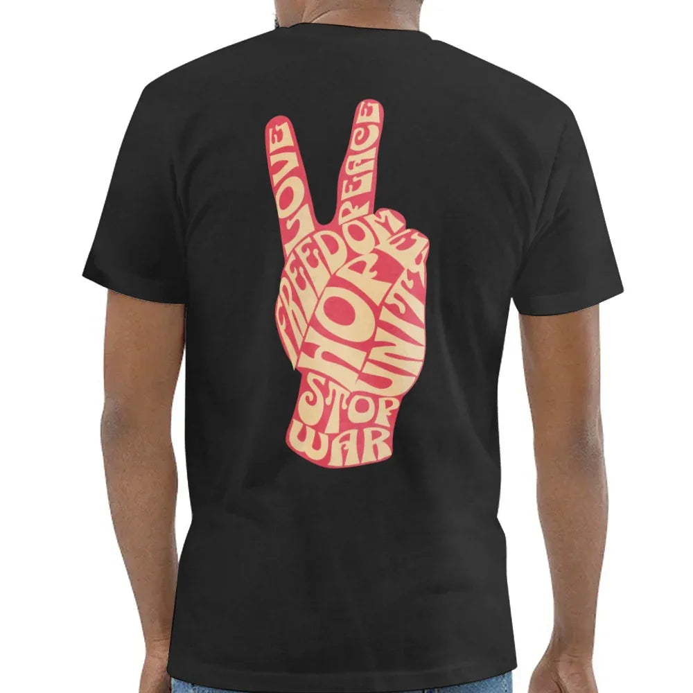 Spread positivity and good vibes with this unique Peace Sign T-Shirt. This eye-catching tee features a retro-inspired design of a hand making the peace sign, filled with words of love, peace, freedom, unity, and a call to stop war. It's a perfect way to express your values and make a statement. Ideal for everyday wear or as a thoughtful gift.